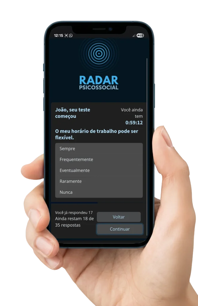 O Radar Psicossocial é uma plataforma digital desenvolvida para realizar a avaliação dos riscos psicossociais exigida pela NR-1, NR-17 e ISO 45003, oferecendo uma solução técnica, validada e totalmente aderente à legislação. Criado especialmente para empresas de Saúde e Segurança do Trabalho, o sistema aplica questionários científicos reconhecidos internacionalmente, como o HSE IT, PROART e COPSOQ, garantindo resultados confiáveis, sigilosos e comparáveis. A ferramenta coleta dados de forma estruturada, gera relatórios automáticos prontos para o PGR e permite filtros por setor ou GHE. Com interface intuitiva, aplicação via celular ou computador e suporte à LGPD, o Radar Psicossocial transforma um processo complexo em uma experiência simples, rápida e segura — unindo ciência, conformidade e gestão inteligente de pessoas.